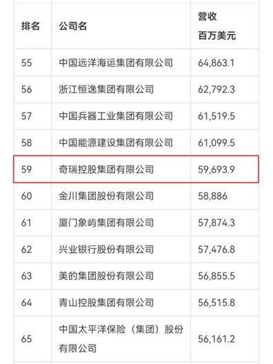 本报记者 彭学英 / 吴明 张骅 中国500奇瑞大涨41位,世界500强还会大跃升? 在7月22日发布的2025年《财富》中国500强排行榜中,奇瑞控股集团有限公司(简称奇瑞集团)第三次登榜,排名第59位,比2024年大跃升41个位次。考虑到《财富》中国500强的排名方式与《财富》世界500强一脉相承,这也让外界对7月29日即将发布的世界500强榜单充满期待,在中国500强榜单中火箭速度上升的奇瑞