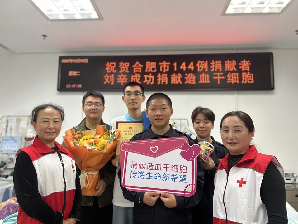 从高分辨检测到捐献采集,整个过程中,合肥市红十字会志愿者的全程陪同,让刘辛倍感踏实,“每个环节都有志愿者耐心讲解,帮我缓解紧张,特别暖心。”同时,学校老师和朋友的支持也给了他莫大鼓励:辅导员称赞他“勇敢有担当”;同学夸他是“大好人”;更有朋友受他影响,主动咨询造血干细胞留样事宜,让爱心得以传递。