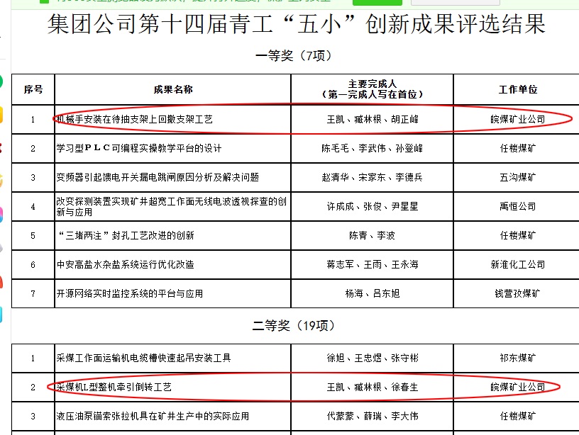 近日,皖北煤电集团公司内网公示2024年度职工合理化建议和第十四届青工“五小“创新成果。其中,皖煤矿业公司安装一工区《机械手安装在待抽支架上回撤支架工艺》荣获青工“五小”创新成果一等奖,《采煤机L型整机牵引倒转工艺》斩获二等奖,《液压千斤顶精准就位支架工艺》喜获三等奖。