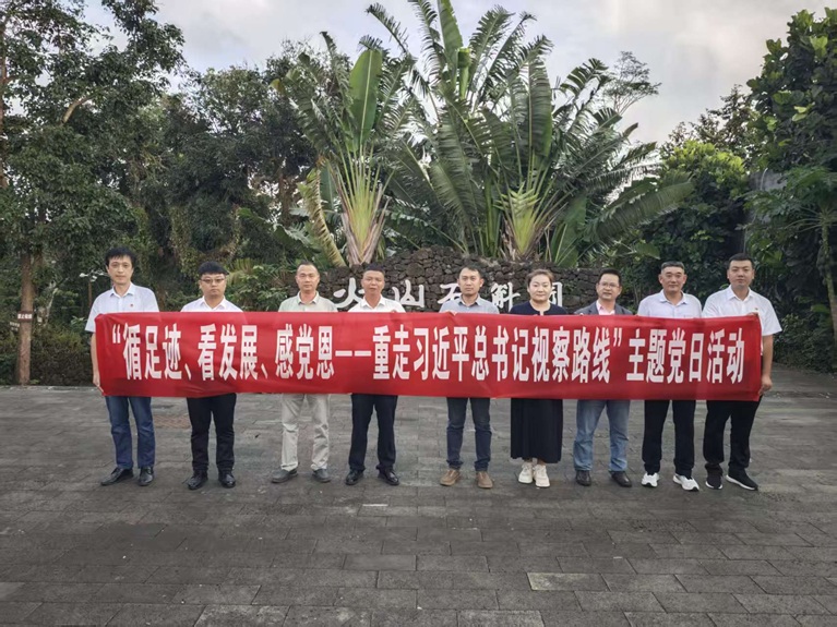 座谈会结束后,三方党员共同前往施茶村火山石斛园,开展“循足迹、看发展、感党恩——重走习近平总书记视察路线”主题党日活动。在施茶村党员讲解员的带领下,党员们沿着总书记当年视察施茶村的足迹,先后参观了石斛种植基地、村史馆等场所,重温总书记视察海南时的重要讲话和重要指示精神。