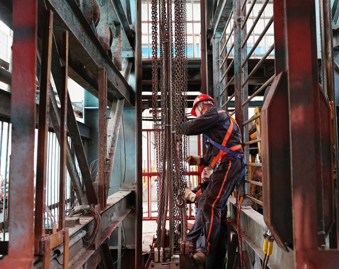 检修期间,该矿主井车房、副井等检修现场,一片热火朝天的忙碌场面,全体检修人员以只争朝夕的工作热情奋战一线,以安全高效的工作质量,有条不紊推进各项停产检修项目施工。