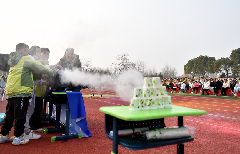 2025年12月30日,在安徽省合肥市安庆路第三小学大杨分校,学生在表演“水火箭”发射。当日,合肥市安庆路第三小学大杨分校举办“学科筑梦 四好同行 三美相伴”学科节成果分享会,“‘水火箭’发射”、“火云掌”、“空气炮”、“无人机”等科技秀逐一亮相,激发了学生科学探索的热情。