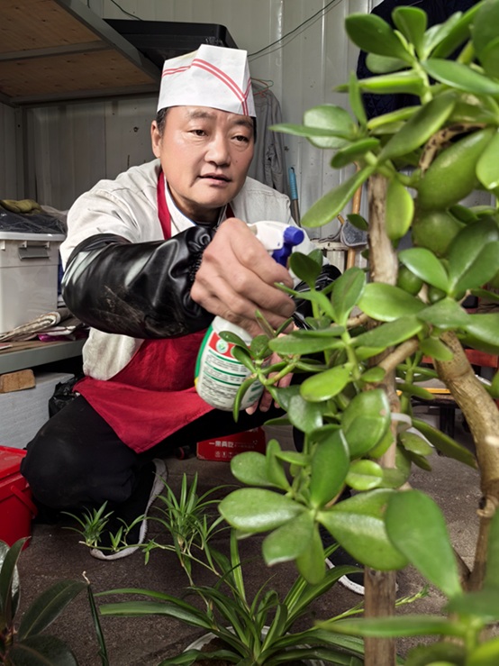 老孟叫孟凡君,是中煤三建三十工程处肖家洼项目部食堂的掌勺大厨,养花有十多年了。转战过六个项目部,行李里总有几个旧脸盆,裹着稻草,装着他的“老伙计”:两盆吊兰、三棵仙人掌、一株从山西带回来的蟹爪兰。谈不上陶冶情操,就是喜欢身边有点活物作伴。