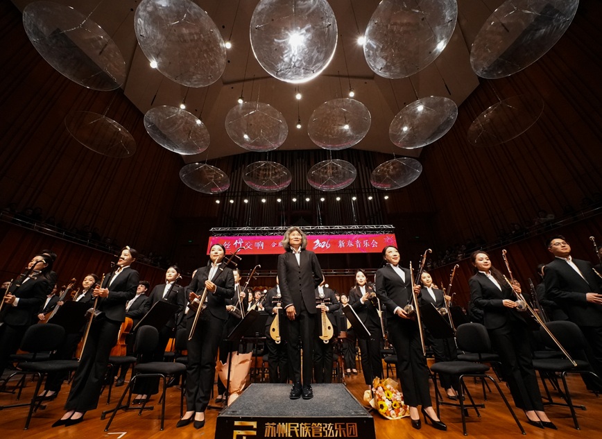作者:彭学英 吴明 张骅 2月7日晚,合肥大剧院内丝竹悠扬、管弦和鸣,第十二季合肥市文化惠民演出活动2026《丝竹交响》新春音乐会在此精彩上演。 苏州民族管弦乐团为合肥市民带来《春节序曲》《茉莉花》《百鸟朝凤》《二泉映月》等多首经典与创新融合的曲目,近两个小时的演出,让百余名观众沉浸式享受了一场视听交融的艺术盛宴。 本次音乐会的执棒者是苏州民族管弦