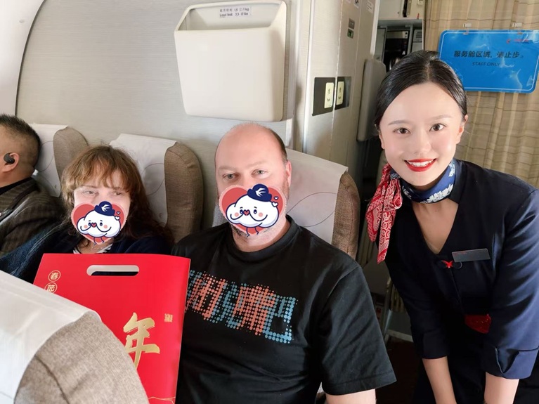航班平飞后,精彩纷呈的主题活动陆续展开。乘务组开设“新春知识小课堂”,与旅客分享春节传统文化;旅客们在万米高空写下祝福话语,参与互动问答。活动中,乘务员向旅客赠送了定制新春明信片、福袋等节日礼品,并同步供应饺子等新春限定餐食及特色饮品,让旅客在归途中品尝到“家的味道”。