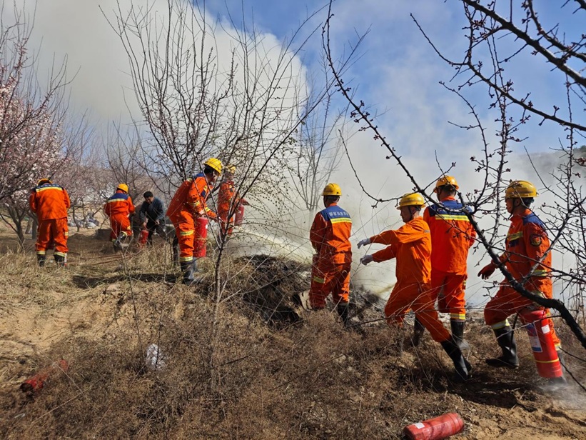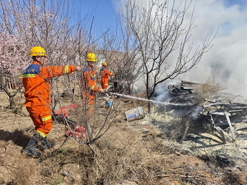 9时35分,车辆抵达位于锅炉房北侧墙头外山坡上的火灾现场,现场距离村民自建房只有四五米距离,周围就是桃树林,若不迅速扑灭火灾,村民的生命财产必然遭受重大损失。查看电源已经切断后,13名救护队员随即手持灭火器进行灭火。虽然火灾面积只有六七十平方米,但因为起火地点堆积的都是易燃的大板和杂物,火势依旧十分凶猛,队员们采取先用灭火器熄灭明火,再用水龙浇灭暗火的策略,10时12分,经过连续半个多小时的紧张战斗,终于降伏了火魔。