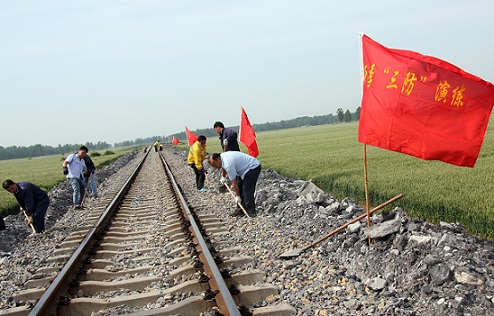 近日,淮北矿业铁运处临涣工务段按照上级雨季“三防”工作要求,组织号召党员、青年以及民兵等突击队员,在铁路塌陷路段开展了雨季“三防”应急演练活动。进一步提高了段在应对雨季“三防”工作方面的组织协调能力、快速反应能力和应急救援能力。图为,该段雨季“三防”演练现场。