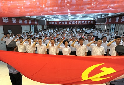 该矿13名新党员们和106名老党员共同举起右手,面对鲜红的党旗庄严宣誓