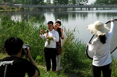 4月24日,一对情侣正在塌陷湖畔拍摄婚纱照。