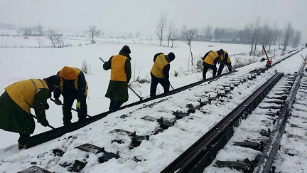 淮北矿业铁运处临涣工务段面对极寒天气雪大路滑、施工难度大的实际,强化施工组织协调,严格执行换轨施工作业程序,确保矿区铁路安全畅通。图为,该段前邱临工区职工正在更换重伤钢轨。