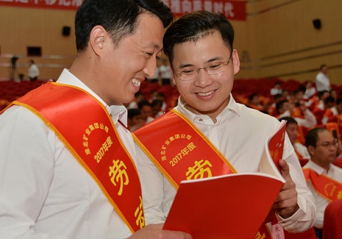 5月3日,在安徽省淮北矿业开发建设60周年庆祝大会暨2017年度综合表彰大会上,90后淮北矿业劳模,许疃矿综掘一区二队队长兼技术员的王红军成为了焦点,上班5年连续2年当选为劳模,他凭着干劲与闯劲,依靠科技创新,创造出了一个又一个成绩,为企业发展增添活力。当日,淮北矿业表彰了117名做出突出贡献的劳动模范。图为,淮北矿业90后劳模王红军(右一)与80后劳模交流学习。